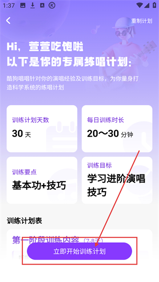 4、在专属练唱计划页点击【立即开始训练计划】,就能开启量身定制的练唱训练啦。
