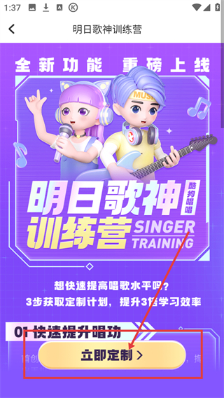 2、在训练营页面点击【立即定制】按钮,就能进入角色选择环节,开始匹配专属练唱方案哦。