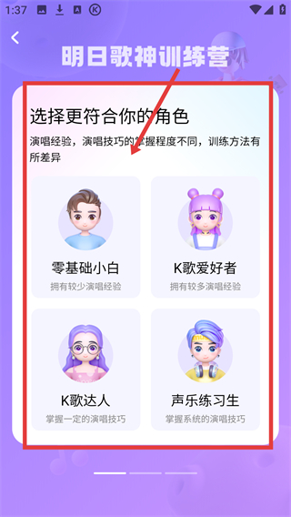 3、在角色选择页挑选符合自己的身份,比如【零基础小白】,就能生成对应的练唱计划啦。