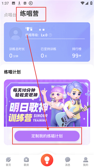 1、在【练唱营】页面点击【定制我的练唱计划】按钮,就能进入训练营的定制界面啦。