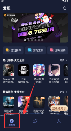 3、切“发现”页选“精选限免”领取星际战甲时长,再点“圣诞大促”享6.75元/月优惠。
