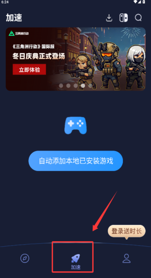 2、在加速页点“自动添加”扫描本地游戏,登录即送时长并立即加速三角洲国际服。