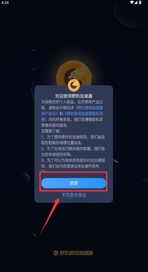 1、阅读协议后点“同意”授权位置与存储权限,确保加速节点与游戏列表正常加载。