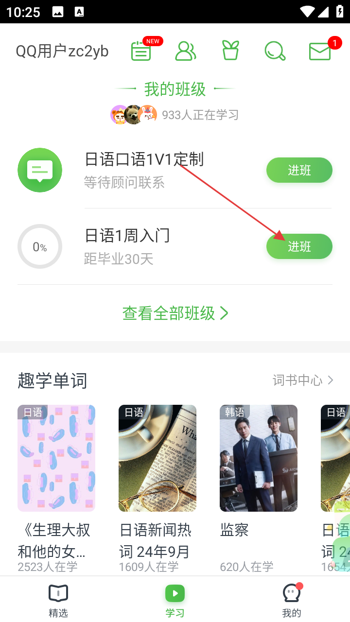 2、在学习页面,能看到【我的班级】,找到想学习的班级,如【日语1周入门】,点击【进班】。