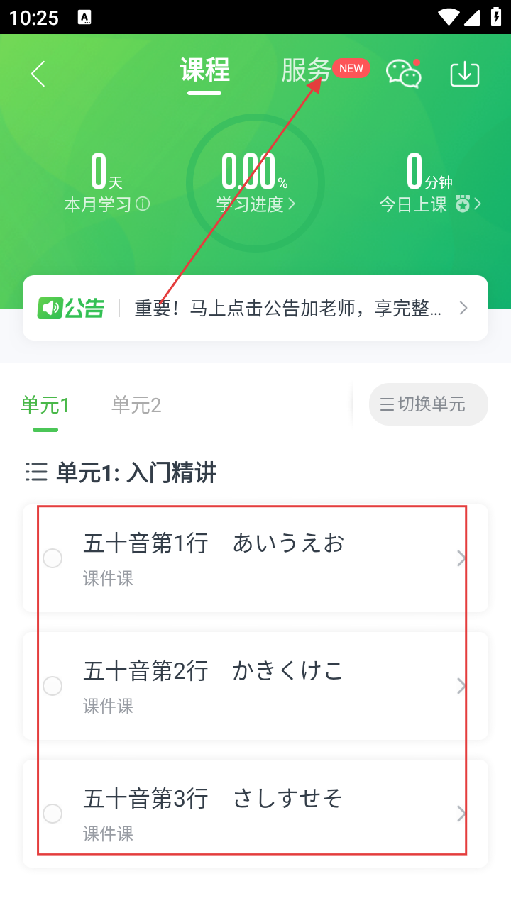 3、进入班级课程页面,可查看单元课程内容,点击顶部【服务】,能获取相关服务信息。