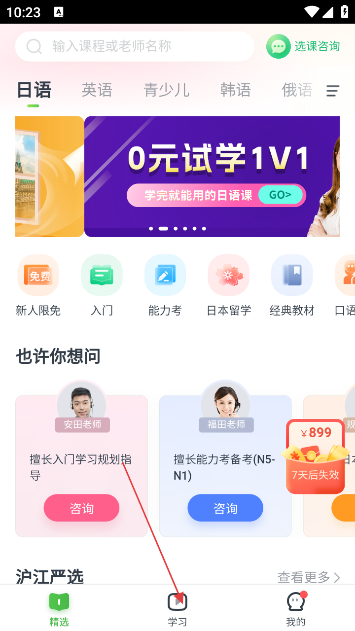 1、打开沪江网校APP,在首页可选择日语、英语等课程类别,点击底部【学习】进入学习页面。