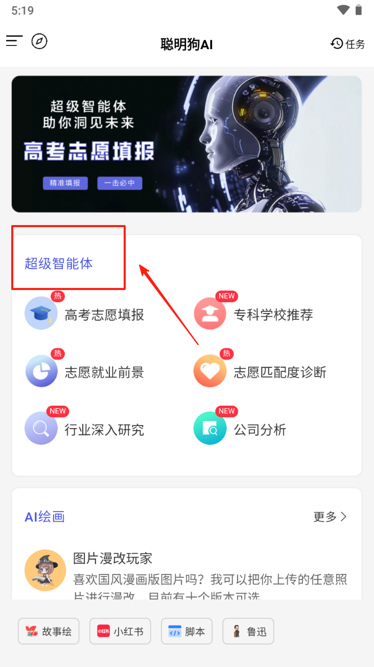 4、在首页选择“超级智能体”以进入智能体功能页面。
