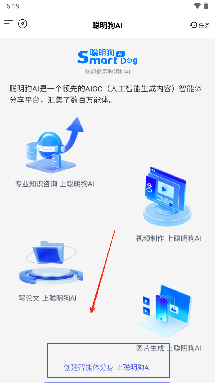 2、选择“创建智能体分身”以开始使用聪明狗AI。
