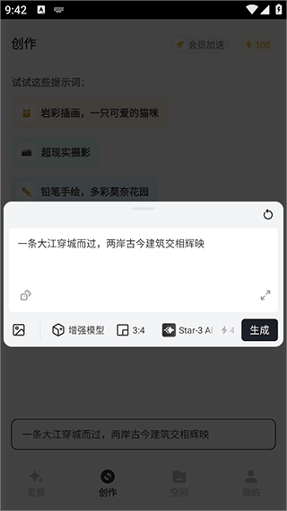 然后向AI输入提示词,比如:一条大江穿城而过,若有多个提示词则用逗号分隔,之后点击【生成】按钮。