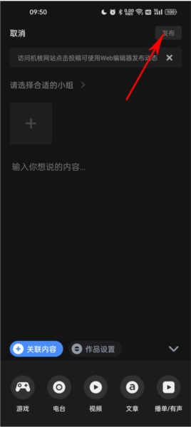 进入发布内容中心后,先填写你想发布的话题以及相关内容,接着选择对应的发布类型,最后点击右上角的“发布”按钮即可完成操作。