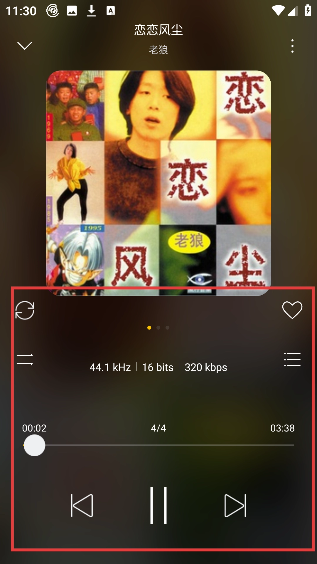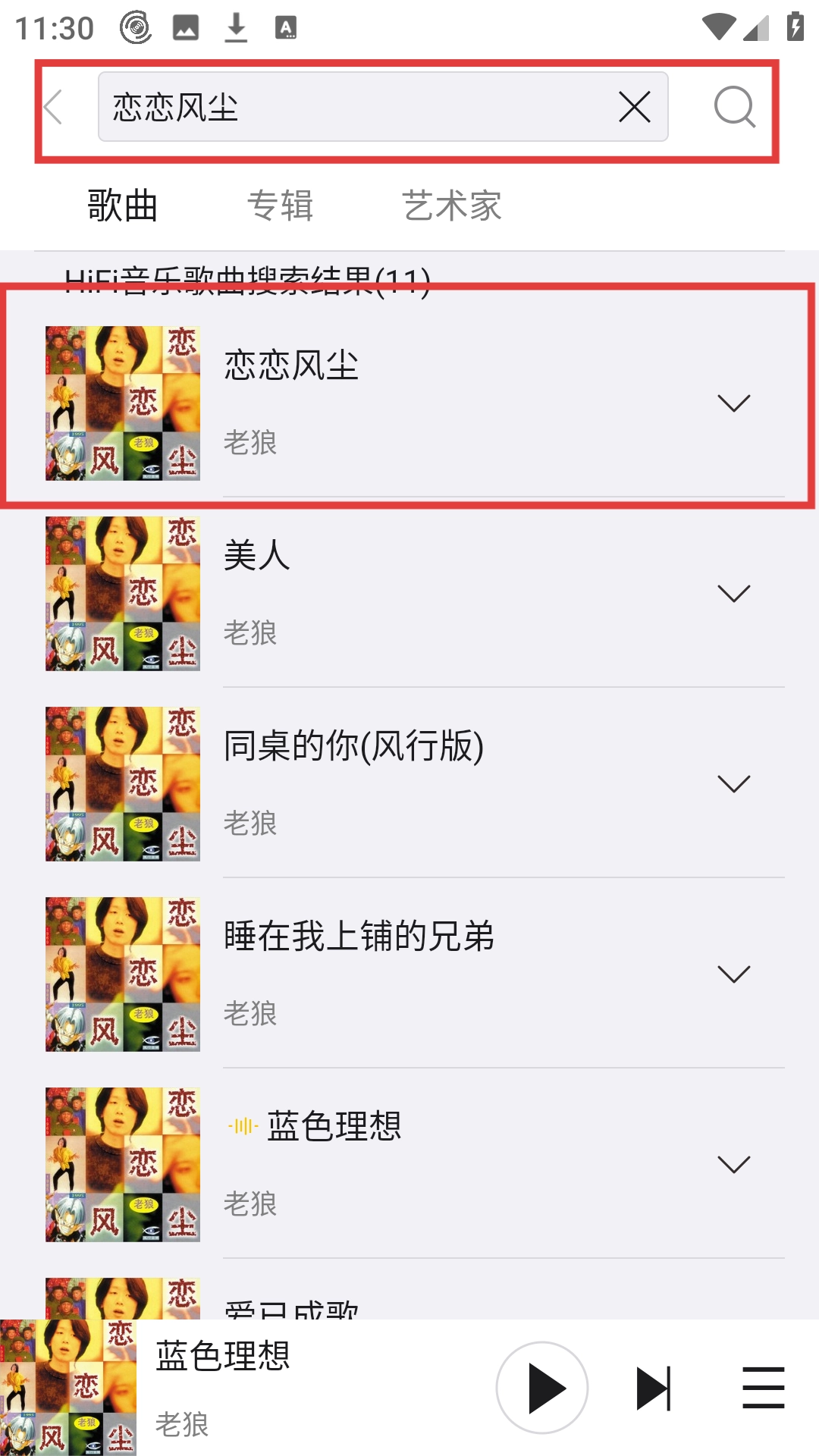 可以在搜索结果里选一首你喜欢的音乐,像老狼那首《恋恋风尘》就挺不错的,选好后点进去就能进入播放页面啦。