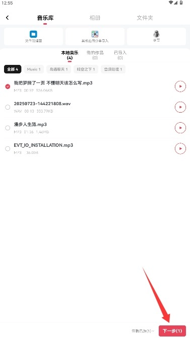 可以从本地音乐库或者在线资源里挑选要编辑的音频文件,选好后点击下一步来确认导入操作。