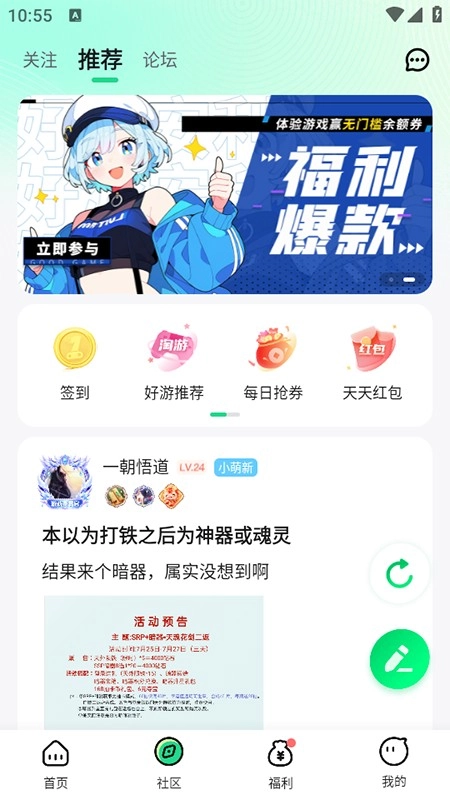 进入“社区”板块后,你可以添加好友、加入公会,借助聊天室或语音通话功能与其他玩家沟通交流;还能参与新游预告等互动活动,以此获得积分、头像框等各类奖励。