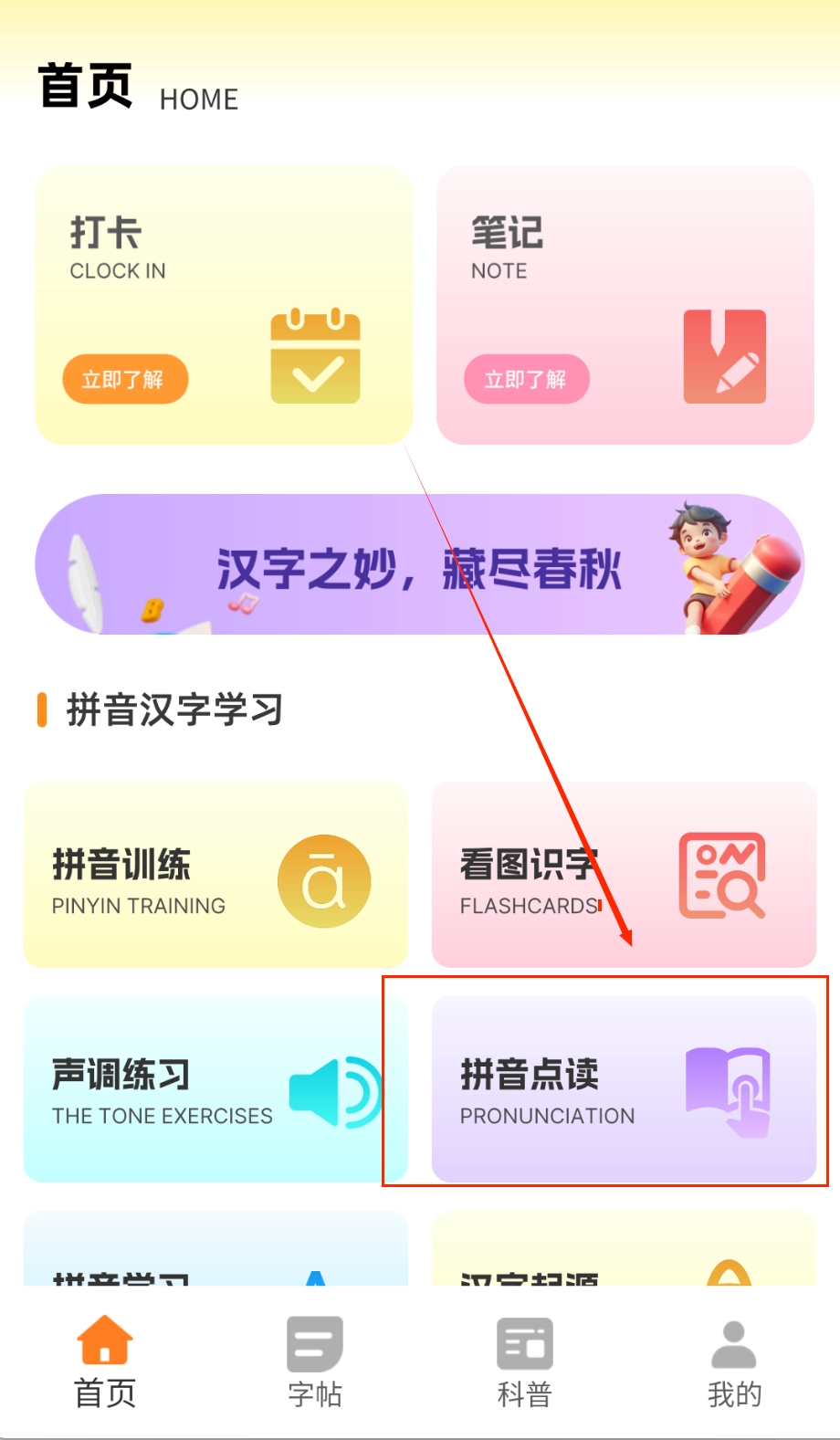 参与拼音点读练习,借助互动游戏来巩固拼音知识。书写功能会展示汉字的笔顺,你可以跟着动画练习正确书写。