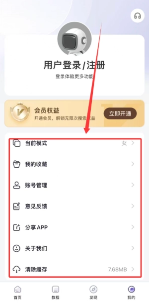 进入个人中心,你可以查看当前应用模式、管理收藏内容、进行账号设置、提交使用反馈,还能查阅软件相关信息。