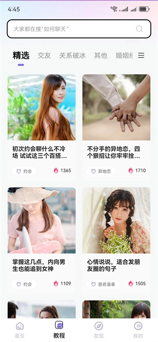 切换到发现板块,你可以学习初次聊天的开场话题、邀约沟通技巧、表白方法指导,还能使用个性化定制情话生成服务。