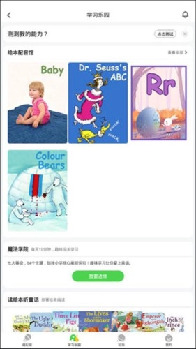 接下来是软件的学习乐园页面,用户在这里不仅能开展能力测试、绘本配音、趣味进修等活动,还可以进行读绘本、听童话以及阅读原著绘本的操作。