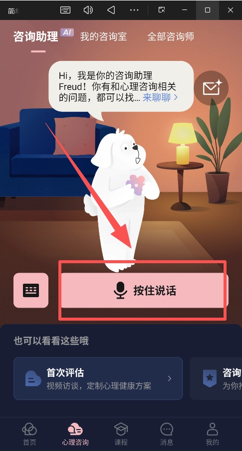 心理咨询页面配备了AI咨询助理,能够协助用户定制心理健康方案,并为用户推荐合适的咨询师。