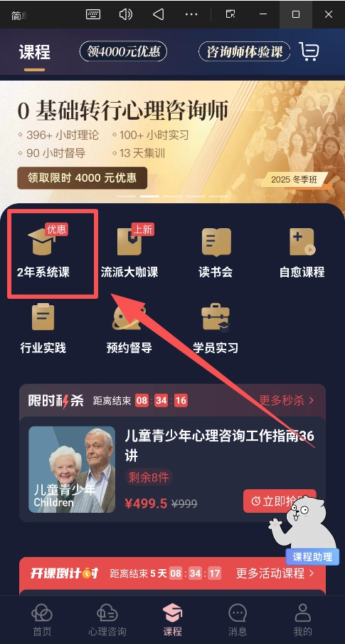 在课程页面中,用户能够挑选符合自身需求的课程。这些课程内容主要涵盖两大类别:一是心理咨询师的培养相关课程,二是帮助用户深入学习心理领域知识的课程。