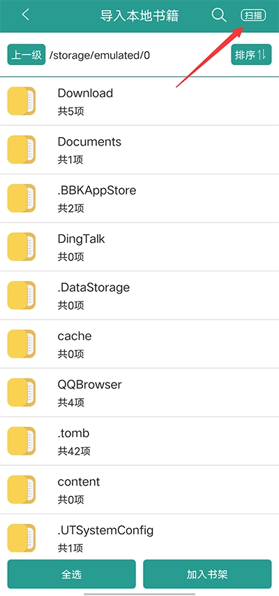 接下来在手机的文件目录里,找到你要导入的小说所在的保存文件夹,也可以直接点击“扫描”按钮来查找。
