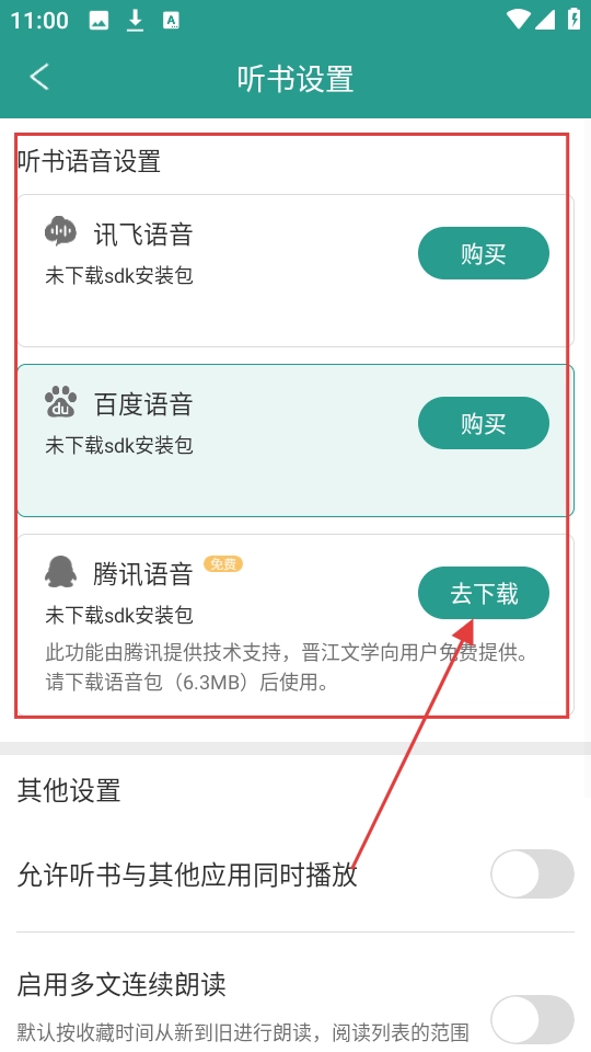在听书的设置界面里,挑选你觉得合适的听书语音,像腾讯语音就可以,接着点击【去】这个按钮,之后就能用这个语音来听书了。