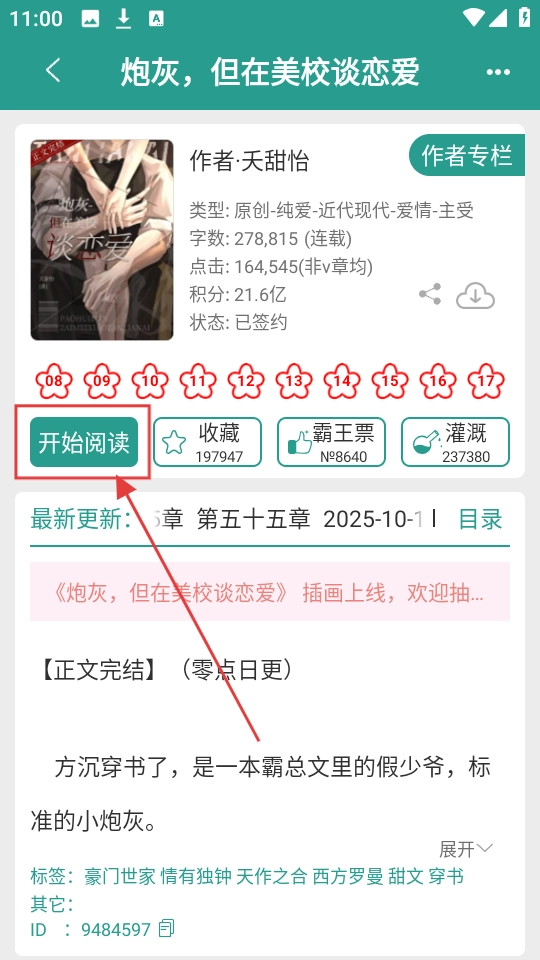 打开书城页面,挑选一本感兴趣的小说,像《炮灰,但在美校谈恋爱》这类,点击进入小说详情页,就可以准备听书了。