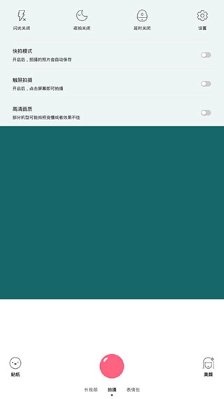 左上角的按钮为我们提供了【更多设置】选项,包括闪光灯开关、夜拍模式、延时模式、快拍模式、触屏拍摄等功能。