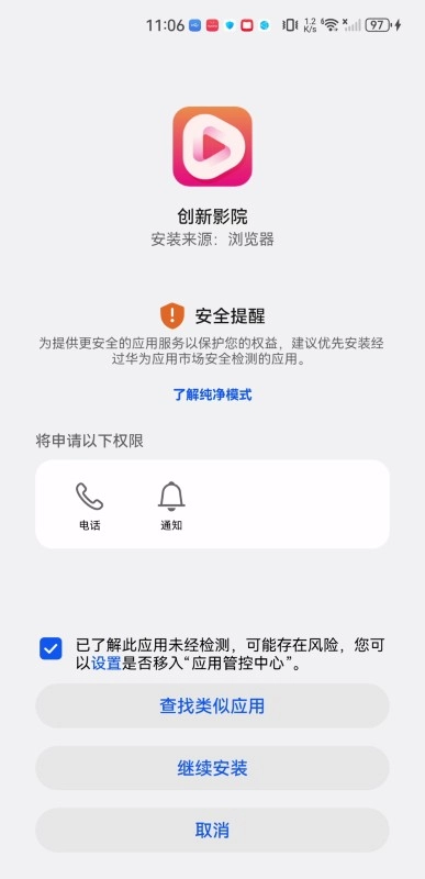 接下来请勾选“已了解此应用未经检测……”这一项,然后点击“继续安装”按钮。(另外,也可以点击查看纯净模式的相关信息)