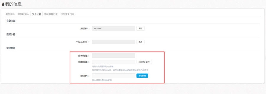 在安全设置页面,您能够完成密保邮箱的绑定以及更改已绑定邮箱的操作,具体情况可参考下图。