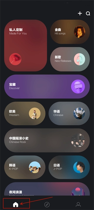 进入应用后,首页默认展示主页内容。在这里,用户不仅能浏览到金曲、新歌等各类歌曲板块,还可以根据自己的喜好自定义首页布局,将喜欢的板块添加到首页展示。