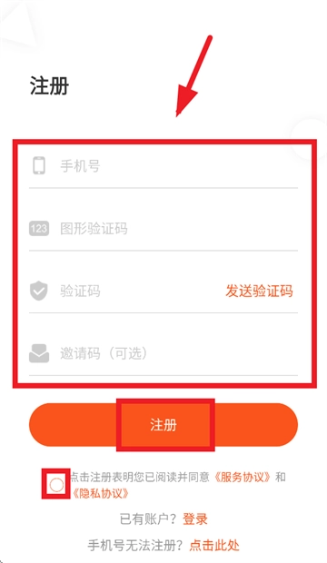 请输入手机号、图形验证码、短信验证码及邀请码,勾选“点击注册”即表示您已阅读并同意《服务协议》与《隐私协议》,确认后点击注册按钮即可完成注册。