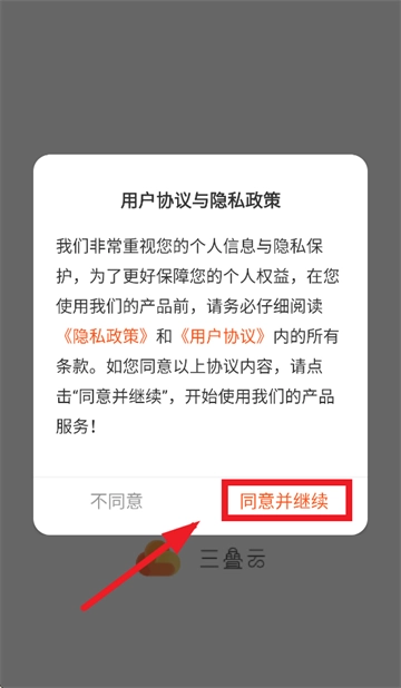 安装并启动三叠云应用,当出现用户协议与隐私政策的提示界面时,点击“同意并继续”按钮。