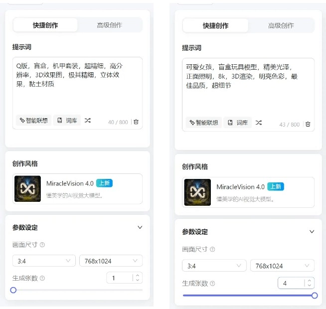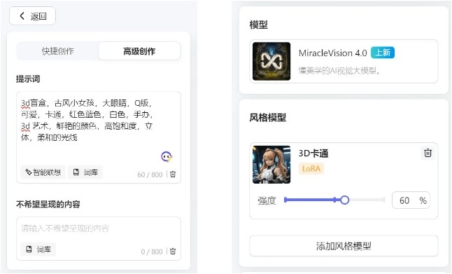 进入快捷创作功能后,在提示词区域描述你心仪的盲盒类型,像软萌的小精灵盲盒、炫酷的机甲战士盲盒都可以,也能搭配色彩和光线效果来补充说明。