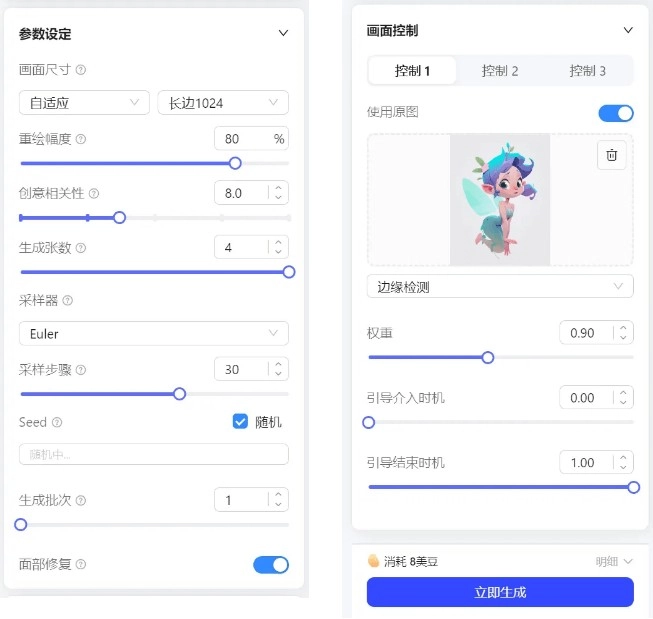 画面控制需上传无色线稿,权重设置为0.8,模型选用边缘检测,然后点击生成!务必注意线稿的线条不要过粗。