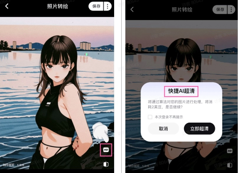 感觉图片清晰度不够?别担心,点击右下角的「快捷AI超清」功能,就能立刻让你拥有超清质感的美图!