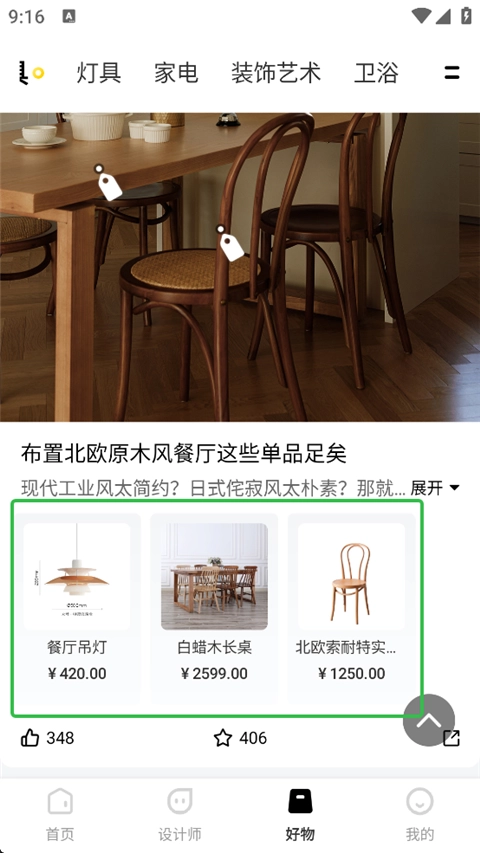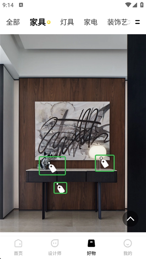 用户能够在这个页面浏览各类家具、灯具、装饰艺术品等,要是看到心仪的,就可以点击飘动的标签来查看详情。