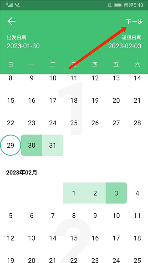 2、开始选择“出发日期”和“返程日期”,然后选择右上角“下一步”选项,