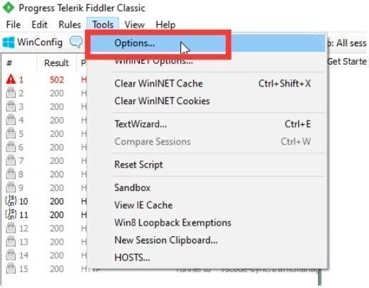 启动Fiddler工具,接着点击顶部菜单栏中的Tools选项,再选择Options。
