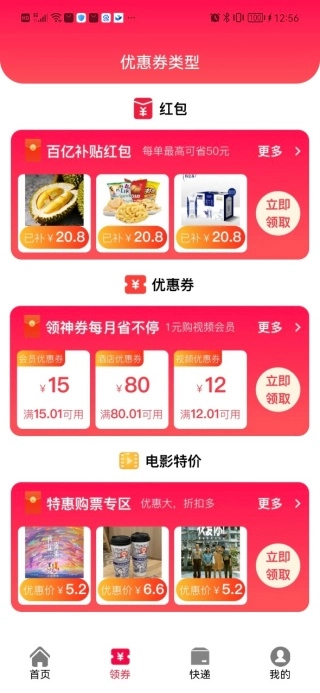 设有丰富的领券优惠专区,涵盖零食、电影票、视频会员、外卖红包等多种福利,满足不同消费需求。