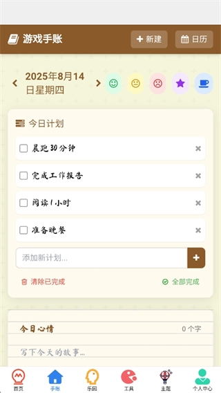 进入手账板块后,你可以创建新的手账内容,并依据日历显示来完成手账记录。