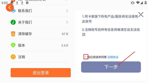 请先勾选【我已阅读并同意注销协议】这一选项,随后点击【下一步】按钮。