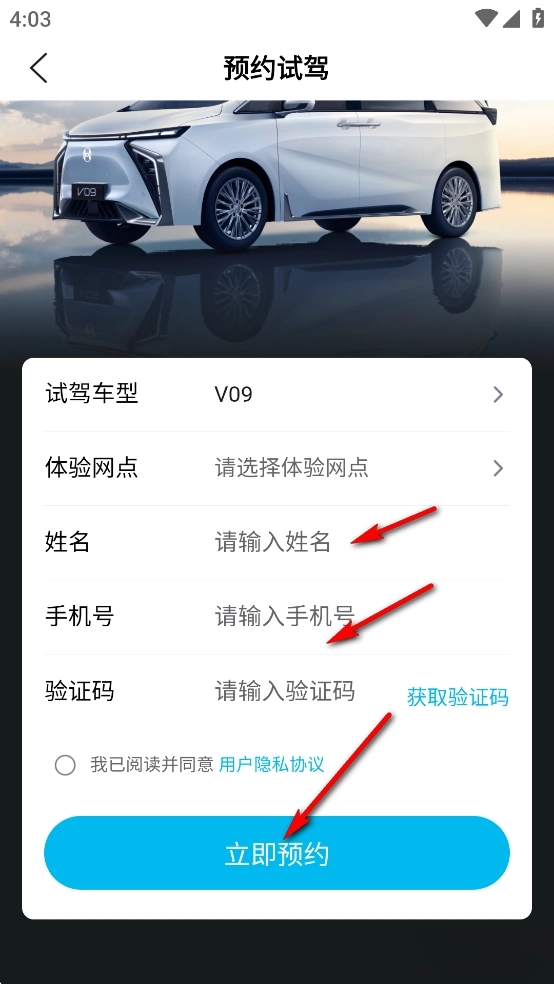 输入姓名、手机号和验证码后点击【立即预约】即可