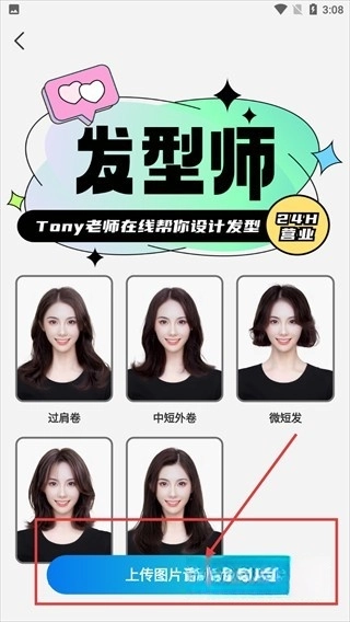 进入【发型师】页面后,你可以浏览多种发型样式,其中包括【过肩卷】和【中短外卷】,若想继续操作,点击【上传图片试发型】按钮即可。