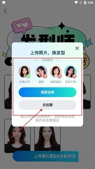 当弹出【上传照片,换发型】的窗口后,你可以通过点击【相册选择】来从手机相册里挑选合适的图片,也能选择【去拍摄】按钮,直接拍摄一张正脸照片,以此来进行发型的试戴。