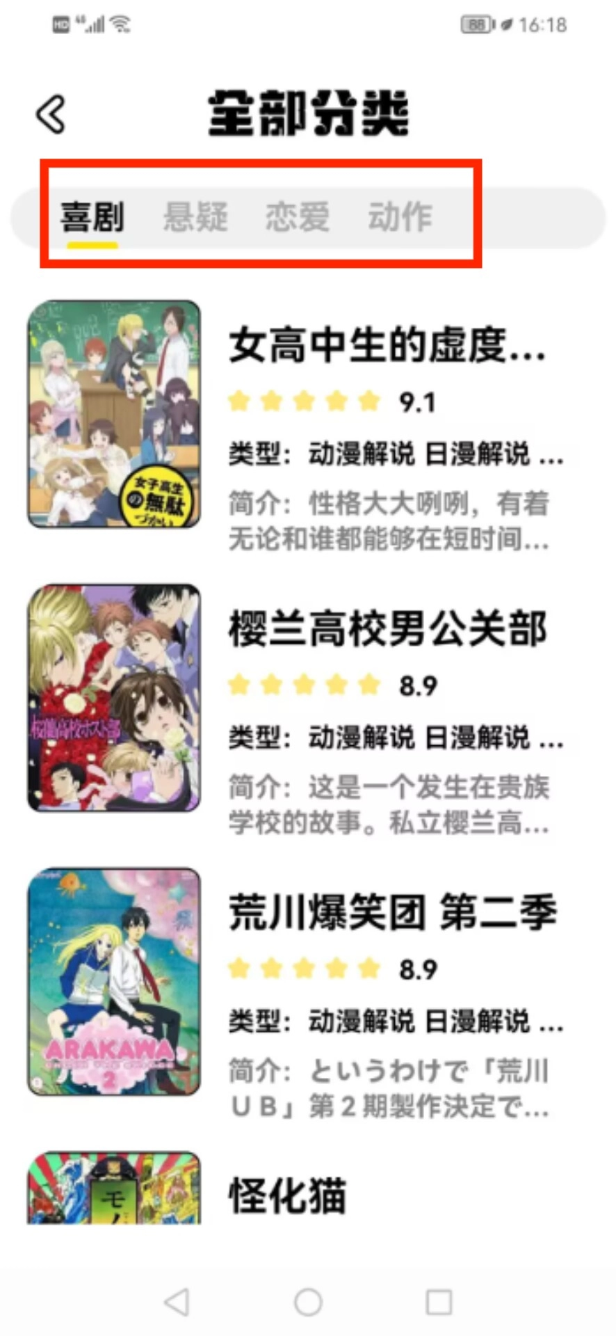 启动应用程序后,会进入分类总览界面,此时选择喜剧标签,即可浏览对应的动画作品。