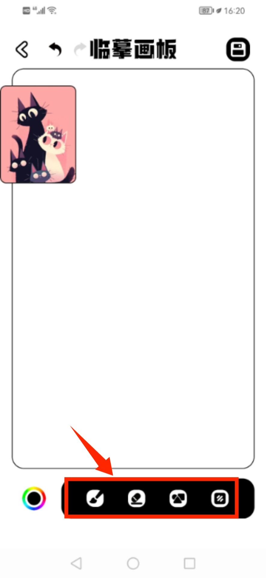 选定模板后进入临摹界面,借助底部配备的绘画工具着手创作。