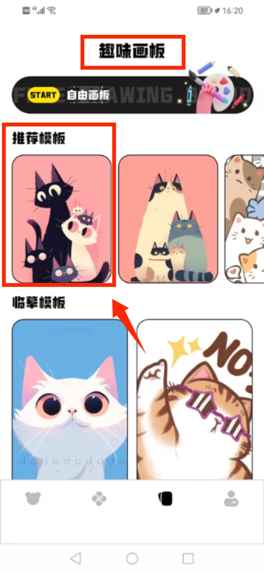切换到趣味画板功能区,从推荐图库中挑选你喜欢的猫咪样式模板。