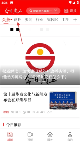 打开软件的新闻页面后,找到并点击“商丘”标签,即可切换至商丘相关的新闻页面。