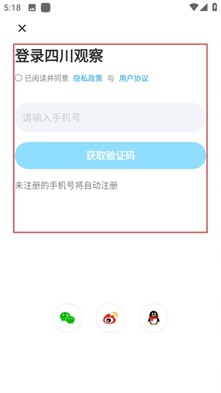 进入四川观察页面后,先勾选相关协议,再输入所需信息,即可完成登录操作。