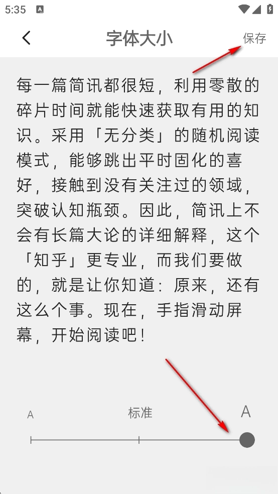 你可以借助下方的滑动条调整字体大小,调整好后点击右上角的【保存】按钮就能把设置保存下来。